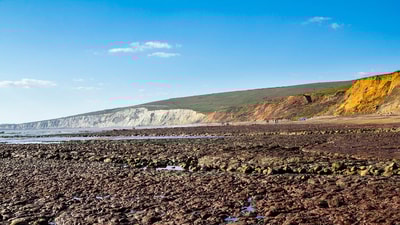 Compton Beach stretches over two miles flanked by sandstone cliffs in a patchwork of colours and ends with Freshwater’s famous white chalk cliffs. The steps to the beach are a little steep, but the chance to take a guided walk through actual dinosaur footprints might just be worth the trek.